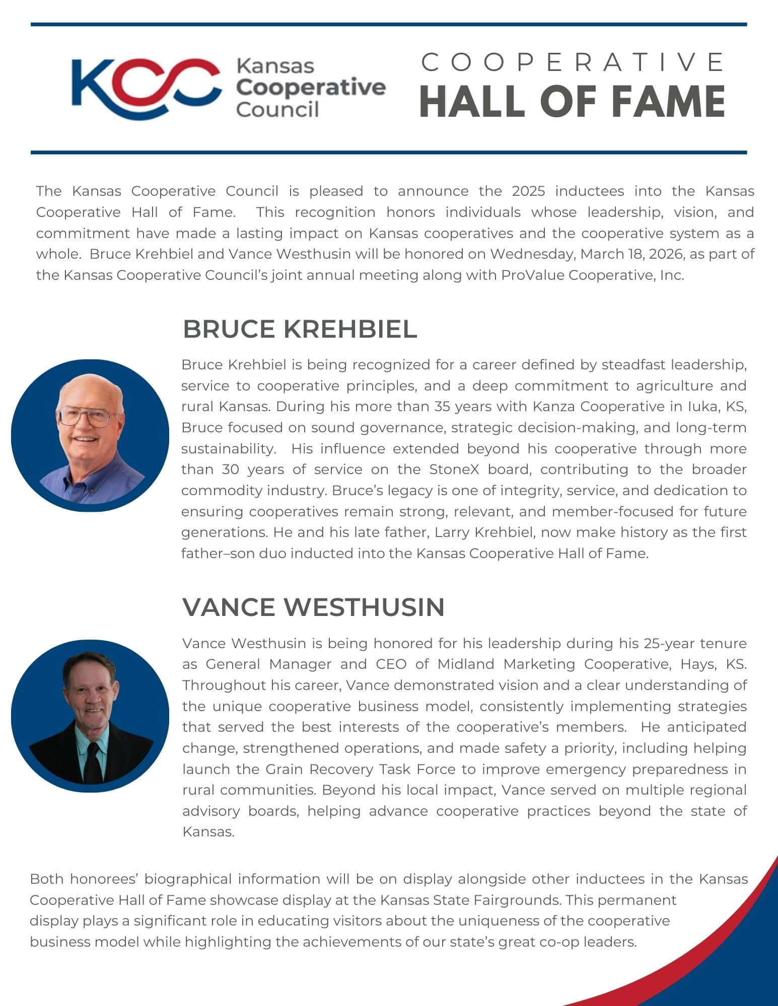 We are excited to announce the 2025 Cooperative Hall of Fame inductees: Bruce Krehbiel of Pratt and Vance Westhusin of Hays. These distinguished individuals have made lasting contributions to our industry and communities, and we look forward to honoring them during the 2026 Annual Meeting in Wichita, Kansas, on March 18, 2026.